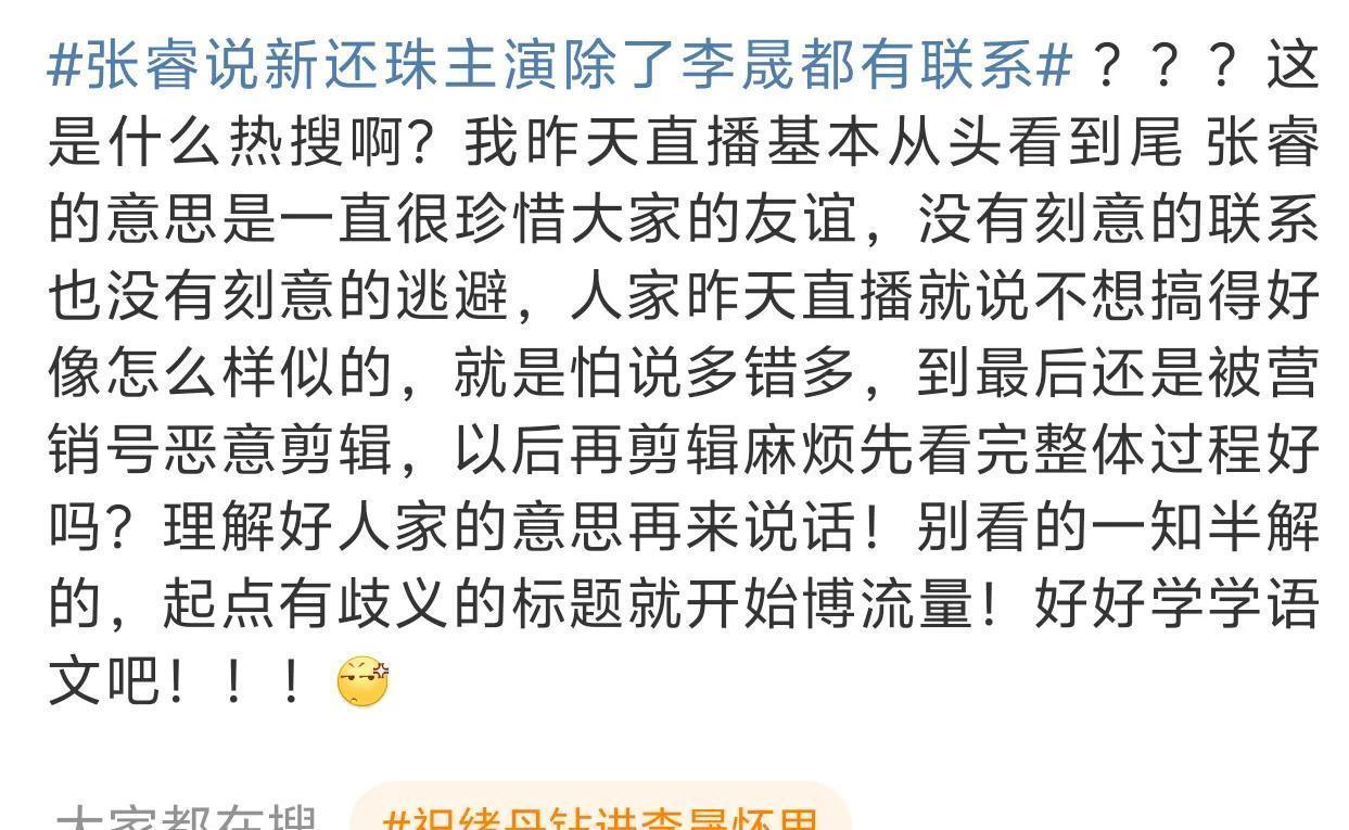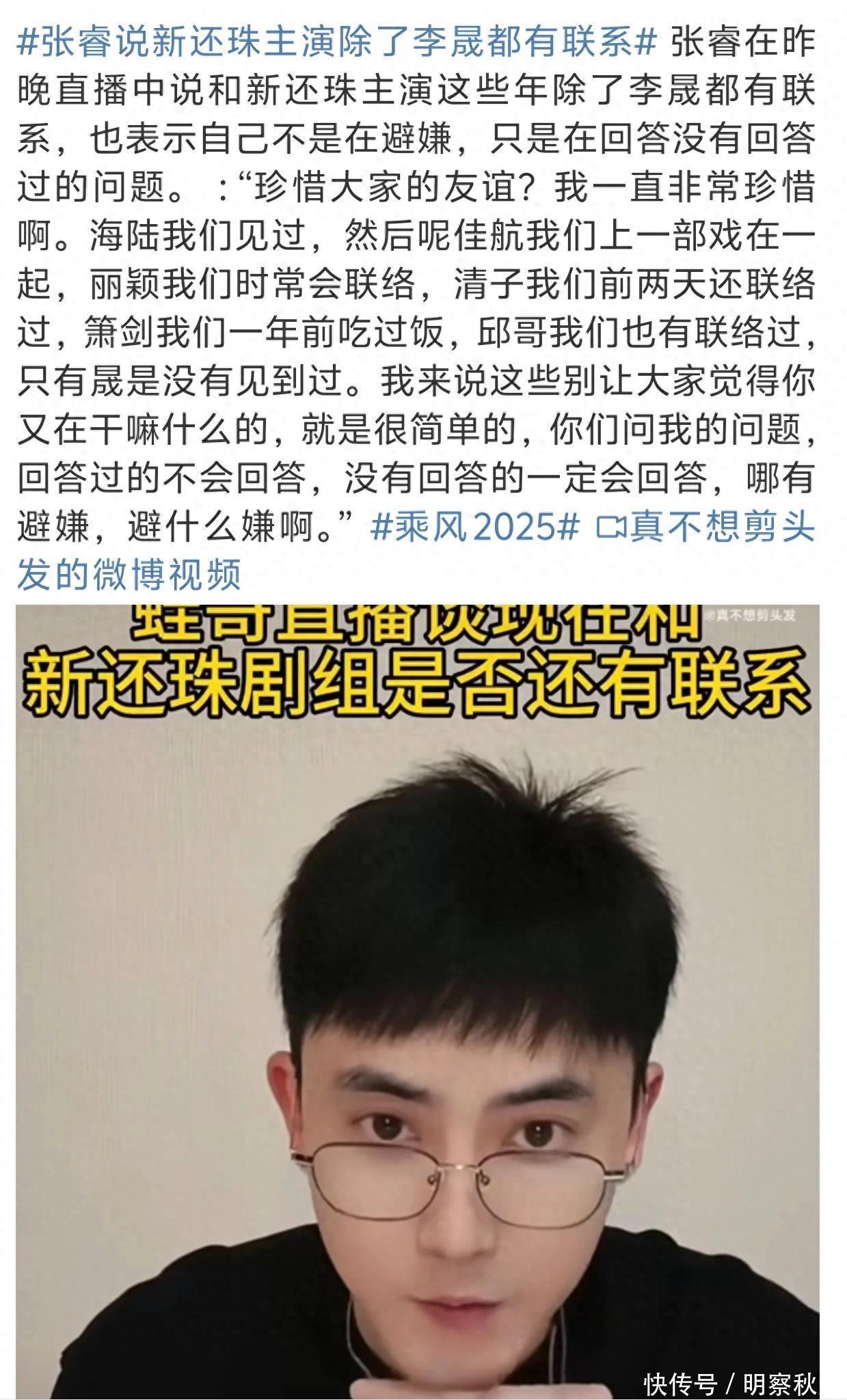 李晟参加浪姐第六季火了一把,把她以前演的剧和CP都带上热搜了,张睿在直播时候就被问到和《新还珠格格》时期的演员关系如何。张睿说他和海陆见过,李佳航不久前一起拍戏,阚清子前两天也联系了,赵丽颖也是经常联络的,唯独李晟没见过了